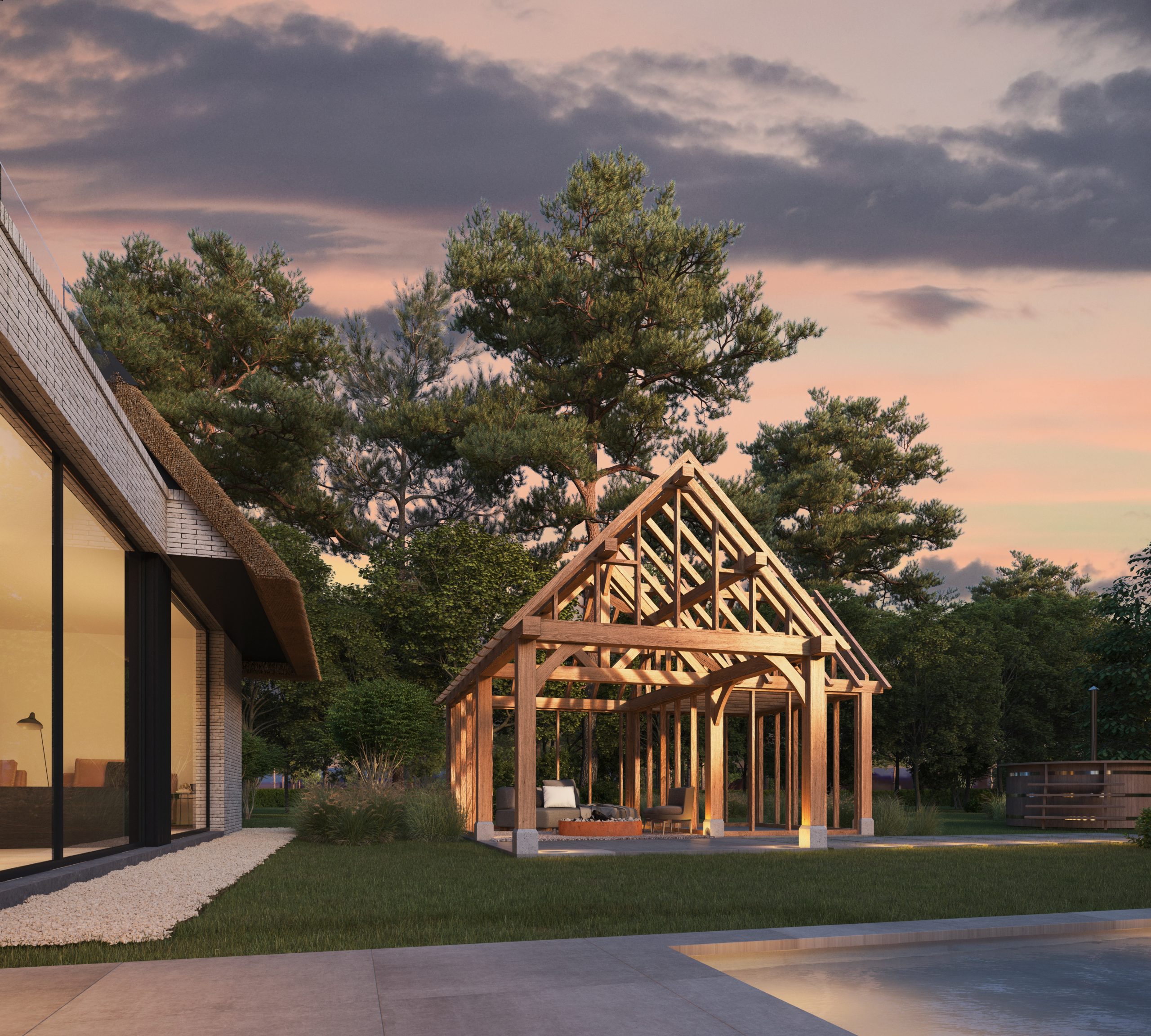 Deze L-vormig schuur/terrasoverkapping met bijgebouw heeft een afmeting van 6x6m. Het zadeldak kan met of zonder wolfskap, wat dit gebouw net dat beetje extra geeft waardoor mensen verliefd worden op de uitstraling. De constructie is een prachtig samenstel van gebinten. Dit ruime bouwwerk biedt uitgebreide mogelijkheden voor elke gewenste functie. Zo kan deze landelijke bijgebouw dienen als uitbouw, tuinkantoor of zelfs terrasoverkapping, garage of carport. Dankzij de royale afmetingen is het perfect voor een vrijstaande plaatsing, onafhankelijk van uw huis, waarbij u de vrijheid krijgt het volgens uw eigen smaak en behoefte te personaliseren